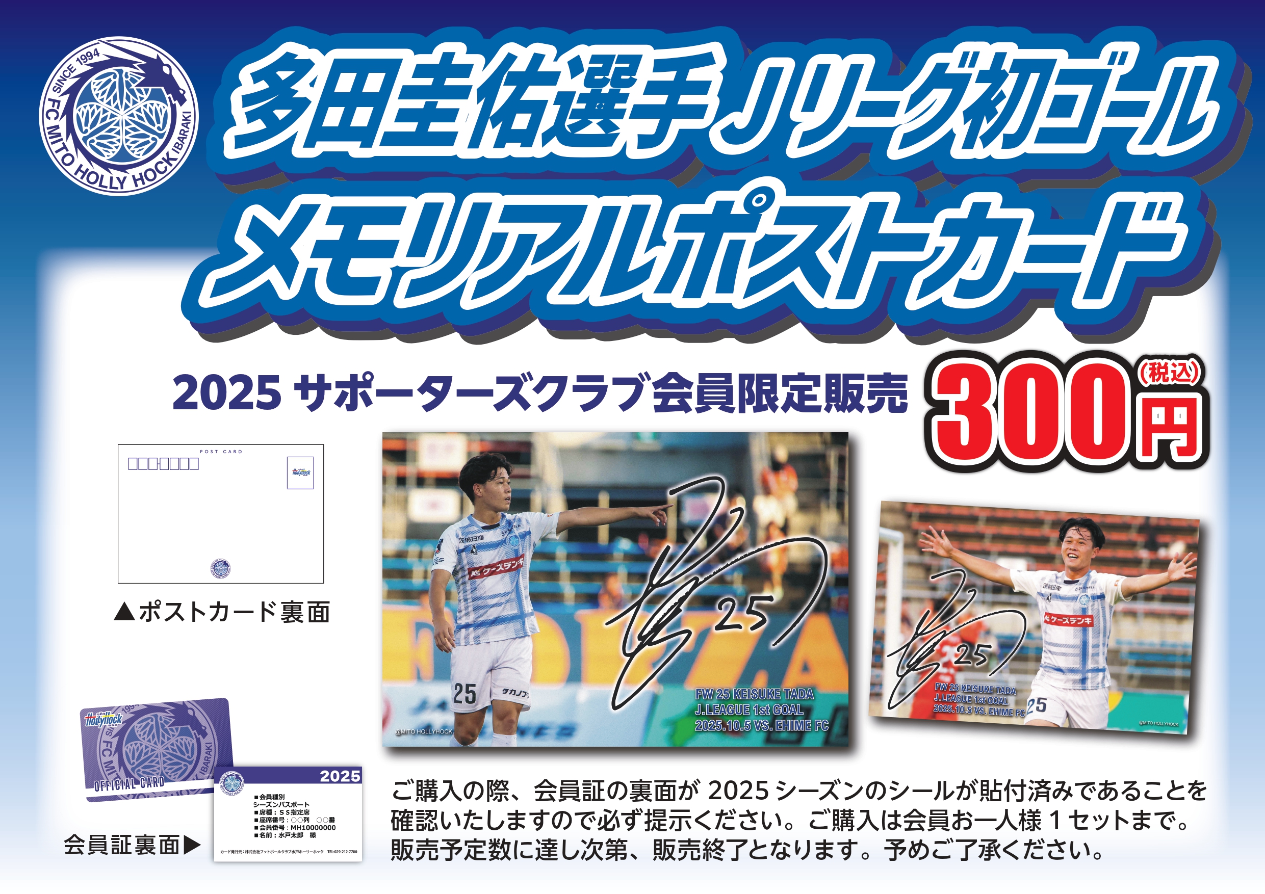 【10/19(日)千葉戦】多田圭佑選手 Jリーグ初ゴールメモリアルポストカード販売のお知らせ